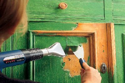 Снять краску с двери при помощи строительного фена, паяльной лампы и других нагревательных предметов можно только с дверного полотна из металла.