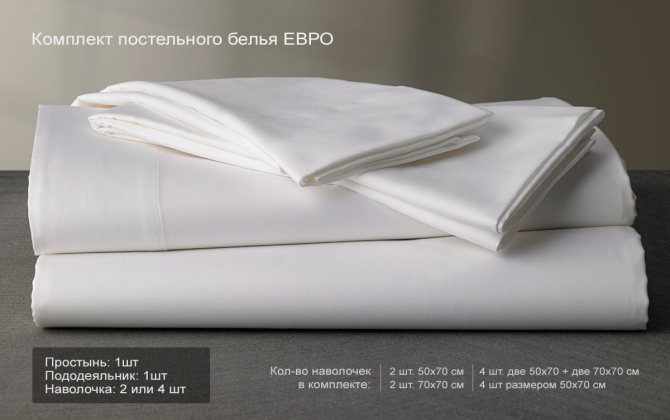 Постельные комплекты белья Евро маркируется в зависимости от габаритов и комплектации: