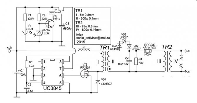 Преобразователь построен на UC3845, силовой транзистор применён IRF3205, вместо снабберной цепочки применён защитный диод на 47 вольт (обязательно установить, иначе схема может умереть).