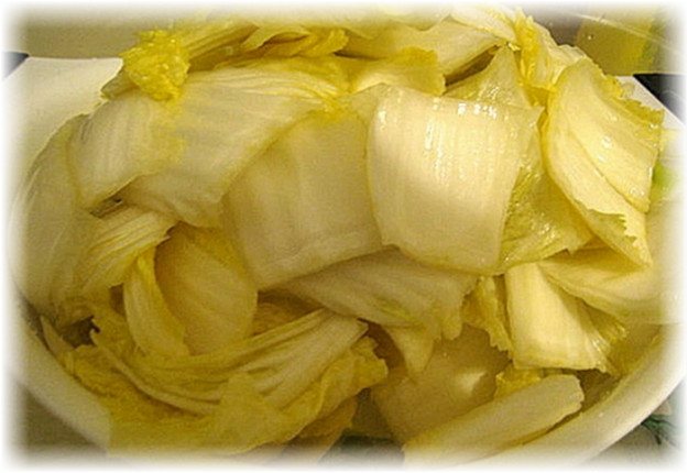Кочаны разделяют на 4 части, листья натирают солью и помещают в эмалированную или стеклянную глубокую посуду, оставляют в кухне на сутки, после чего промывают под краном и вымачивают в прохладной воде 3 или 4 часа Жидкость сцеживают, выложив пекинскую капусту в дуршлаг.