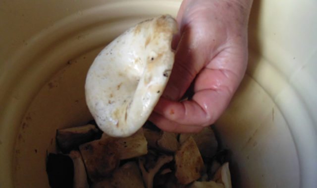 Доставленный из леса урожай нужно чистить, но сначала подвергают предварительной обработке. Первым делом перебирают все грибы. Старые грузди, поврежденные слизняками или червями, сомнительные плодовые тела выбрасывают. Если повреждение незначительное, можно обрезать ножом. Отсортированные грибы руками чистят от крупного мусора. Поверхность шляпки при необходимости чистят ножом, соскабливая прилипшую листву и траву.