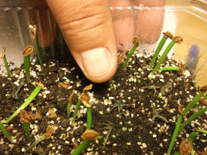 - Контейнер накрывается пленкой или стеклом и помещается на светлый подоконник. Нужно поддерживать температуру +22-24 градуса для того, чтобы появились всходы. В среднем это занимает около месяца.